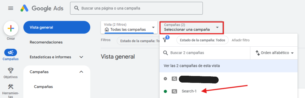 • Seleccionar nuestra campaña en la interfaz de Google Ads.