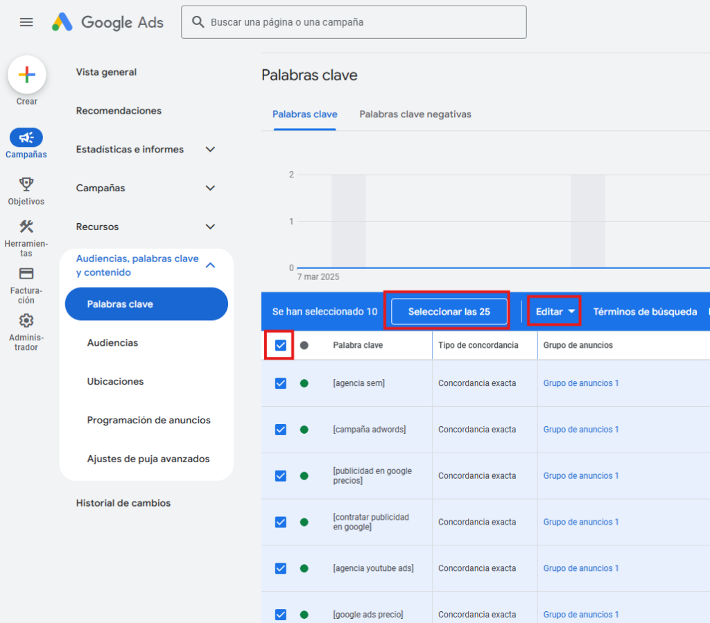 • Selecciona todas las palabras clave de la campaña y haz clic en editar.