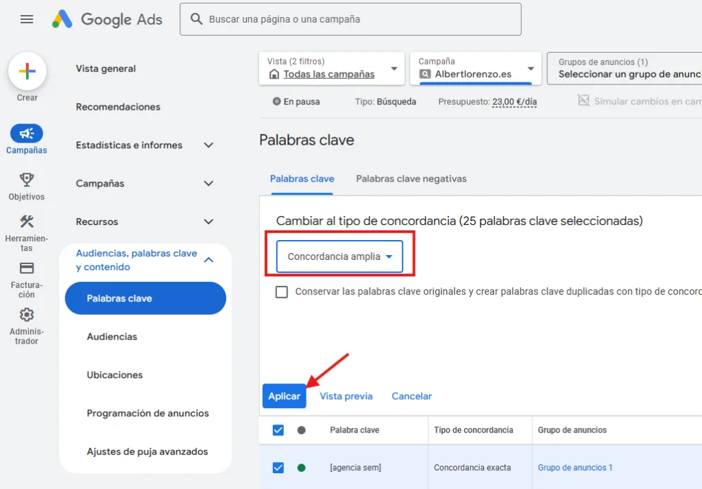 • Haz clic en el cuadrado y selecciona la concordancia amplia, después deberás presionar aplicar.